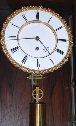 the rosewood veneered back of the clock is modern, as are the beveled panels, which have been done at great expense. The bench made Viennese movement is of high quality, clean and running. Height 42 inches