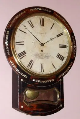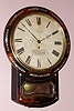 English, round drop dial, chain fusee wall timepiece, 8-day, with MOP inlay, C.1860 Refinished rosewood veneered case with MOP inlay in very clean condition. Original painted dial has a couple of small chips, some stains and an attempt to touch-up the chapter ring, but not bad. Hands are original. Retailers name: Simcock in Warrington on dial. Spun brass bezel with repair. Well made chain drive fusee movement has bulbous contoured pillars and shaped plates. Height 21 inches