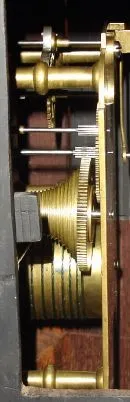 Refinished rosewood veneered case with MOP inlay in very clean condition. Original painted dial has a couple of small chips, some stains and an attempt to touch-up the chapter ring, but not bad. Hands are original. Retailers name: Simcock in Warrington on dial. Spun brass bezel with repair. Well made chain drive fusee movement has bulbous contoured pillars and shaped plates. Height 21 inches