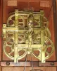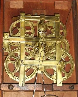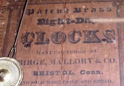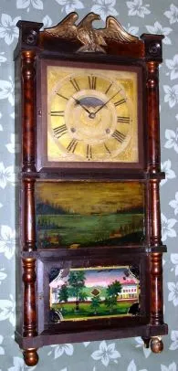 Birge, Mallory and Co., triple deck shelf clock with eagle splat, with large strap brass, roller pinion movement, 8-day, 2-wt. C. 1840. mahogany veneered case retains original finish, but has been varnished over and gilt portions now painted gold. Columns look like the original gilt caps may be under the dirty over-coating. Cap on the right chimney has been replaced. Orig painted dial has age darkened with loss; original mirror/slide intact. Bottom tablet is original, with loss; hands are orig. Center tablet was probably a mirror, now painted. Escutcheon missing from top door. Rt foot with loss to gesso. Height 39 inches
