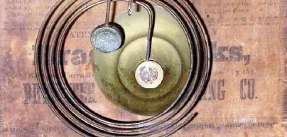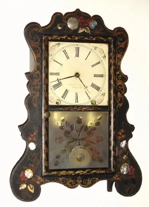 Brewster Mfg. Co., Bristol, Conn, Stenciled SCROLL FRONT, 8-day time and gong strike, spring, with cut/frosted glass tablet. C.1853. overall excellent original condition,, with all MOP and the stenciling intact. A great painted, signed dial with fading but still legible signature and good floral corners. Good label. A fine example of this model with uncommon label. Height 16.5 inches