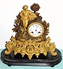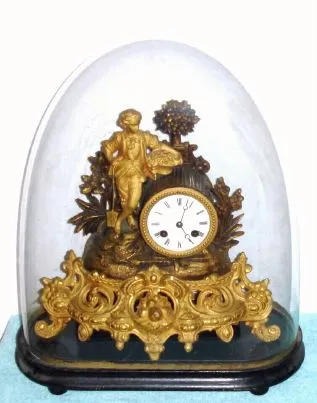 German, Lenzkirch, Cast /gilt mantel clock of a young farmer In Sunday clothes + his basket of roses, 8-day bell strike, serial No. 263496, with a period dome and base. C.1863 this clock seems to have been under a dome for most of its life; there are some minor corrosion spots where the cast white metal is coming to the surface, generally on the rear of the case. The movement is complete and sound, ticks and strikes, but may need service for long term use. Porcelain dial is xlnt and hands are original. Ht of clock = 13". Dome itself measures 14w, 6d and 16" high, and is light and flawless.