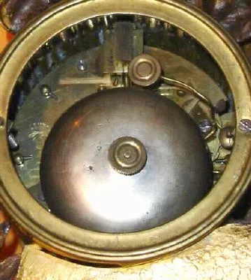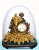 this clock seems to have been under a dome for most of its life; there are some minor corrosion spots where the cast white metal is coming to the surface, generally on the rear of the case. The movement is complete and sound, ticks and strikes, but may need service for long term use. Porcelain dial is xlnt and hands are original. Ht of clock = 13". Dome itself measures 14w, 6d and 16" high, and is light and flawless.