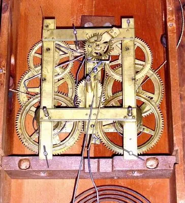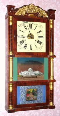 refinished mahogany veneered case has some veneer chips on the base. Gilded areas on the columns have been over-painted gold. Original painted dial with minor losses. Hands are original. Lower 2 tablets are original, center of Crystal Palace, NY has some losses. Overall good+ condition.
