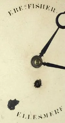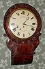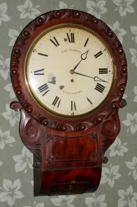 English, Round drop dial, single fusee timepiece, in a mahogany case, wall hanging. C.1880. the case of veneers and solids retains old/original finish. There is a bit of veneer missing just above the lock and another along the bottom edge. A horizontal molding just above the curved base is missing. Original painted dial has some loss at 8 + 12. Hands are original. Left "ear" or carved accent has a glue repair; there is a crack along the right "ear". Some worm damage in the rear bezel supports and box. Pendulum is correct and regulates a robust fusee movement, cable drive. Dial signed Ebe'r Fisher, Ellesmere.