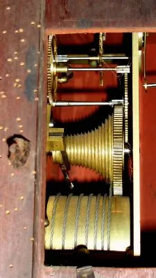 the case of veneers and solids retains old/original finish. There is a bit of veneer missing just above the lock and another along the bottom edge. A horizontal molding just above the curved base is missing. Original painted dial has some loss at 8 + 12. Hands are original. Left "ear" or carved accent has a glue repair; there is a crack along the right "ear". Some worm damage in the rear bezel supports and box. Pendulum is correct and regulates a robust fusee movement, cable drive. Dial signed Ebe'r Fisher, Ellesmere.