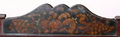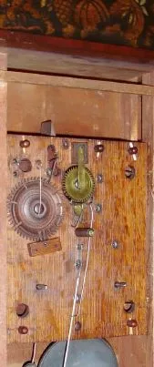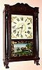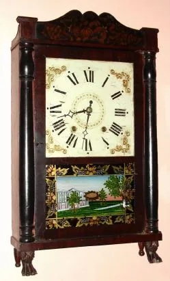the stenciling is worn off the columns, there is a crack in the original tablet, and one toe is knocked off. The clock is otherwise in very good to excellent original condition. See NAWCC Bulletin, 4/99, No. 319, pg 168, figs 5A-B for similar clock; ours is 90% better than that illustration. Orig gate latch on door, works well. Height 28 inches
