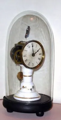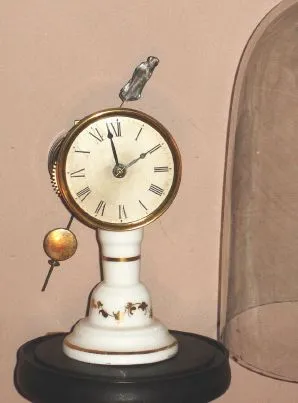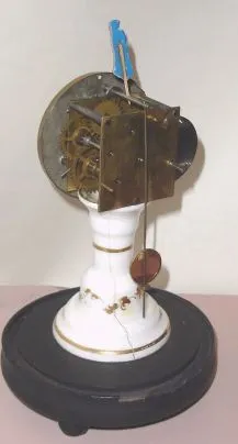a clean clock with period dome. Milk glass stand has a crack running from top to bottom; facing rear; there has been no attempt to glue the crack, which might /? be considered. Paper dial is original with some slight discoloration and a very small stain. Hands are original. Figure mounted on top of the pendulum is new. Many collectors incorrectly identify these clocks as those from Terry Clock Co., Height 8.5 inches