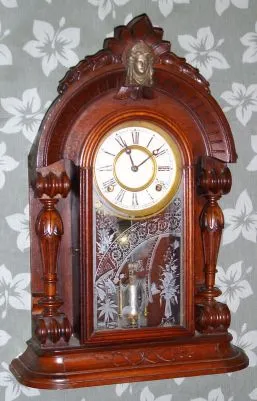 Waterbury Clock Co, Walnut Parlor clock with single barrel pendulum, note full round fluted columns and Diana bust in crest, 8-day spring, C.1880