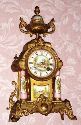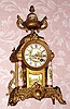 French, Samuel Marti, gilt metal with porcelain china accents, mantel clock, 8-day time and gong strike. C.1890.