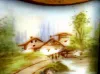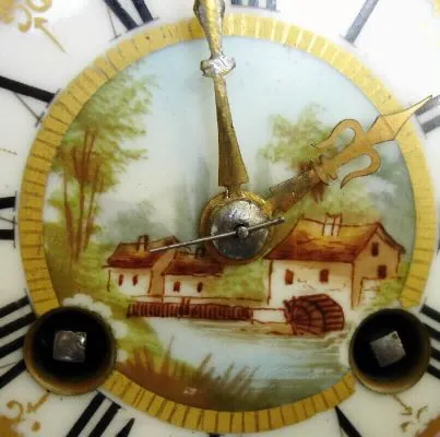 the spelter case has lost most of its gilding over the years. The hand painted porcelain accents (dial, finial, side columns and plaque below the dial) are still in excellent condition. Movt signed with Marti award medallion. Height 14 inches