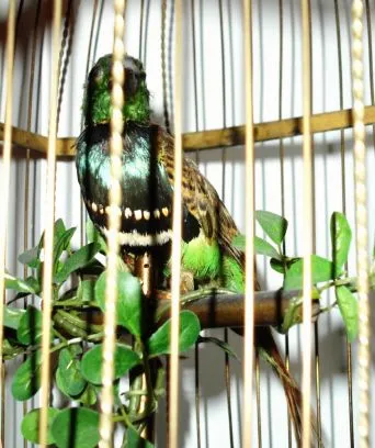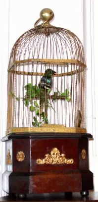 Swiss, coin operated singing bird in cage, large and loud, C.1890