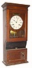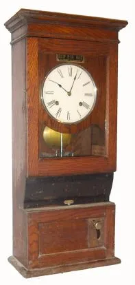 the ribbon is absent, so the time mech is only making a mark on the card, however, it is in good shape and complete with the little drive-shaft between the two mechanisms. The oak case is sound; door lock present but no key. Pendulum has some dents on the edge. Dial has been repainted plain, no logo, but all the patent cards and plaques are intact. Original T-key intact. Height 35 inches
