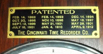Cincinnati Time Recording Co., Cincinnati, O., heavy oak cased punching-in clock with robust Seth Thomas double spring movement, C.1930 the ribbon is absent, so the time mech is only making a mark on the card, however, it is in good shape and complete with the little drive-shaft between the two mechanisms. The oak case is sound; door lock present but no key. Pendulum has some dents on the edge. Dial has been repainted plain, no logo, but all the patent cards and plaques are intact. Original T-key intact. Height 35 inches