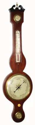 English, Unsigned, Banjo barometer, with glass tube and mercury intact, working, also with hygrometer and silvered scale thermometer, C.1860 the dust cover on the rear has been replaced, otherwise in excellent original condition. Although UPS will now accept these as scientific instruments, we do NOT have a packer who can guarantee safe arrival, so this item must be picked up if you are successful. Another item from Goddard's living room. Height 38 inches