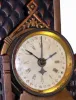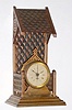 Parker Clock Co, unusual 1-day desk calendar in a novelty case of brass, the clock setting in a small roofed alcove. This is a rear wind, rear set clock and retains its special key for doing both. C.1895.