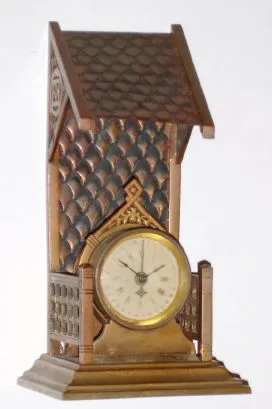 Parker Clock Co, unusual 1-day desk calendar in a novelty case of brass, the clock setting in a small roofed alcove. This is a rear wind, rear set clock and retains its special key for doing both. C.1895. there is some minor wear to the copper color finish on the case, and a very slight bend in the back; the time and calendar numerals were printed on ivorene and are visible, but almost all rubbed off. Ticks. Height 7 inches
