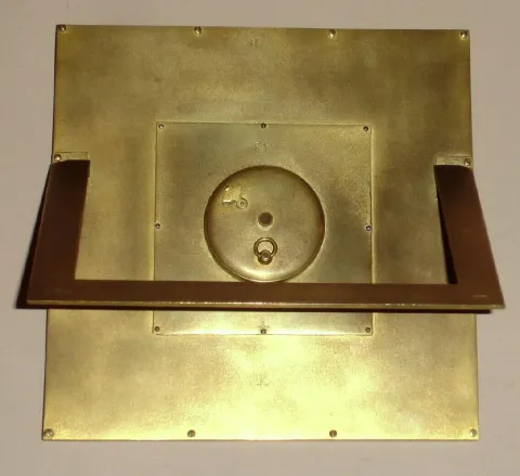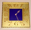 Swiss 8 day spring driven Art Deco desk clock in square gilt frame with blue enamel center, c1920, No. 81 on case good running order, ticks, the case and dial are in very good condition with little oxidation, the enamel on the dial is perfect. Ht 8"