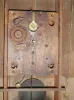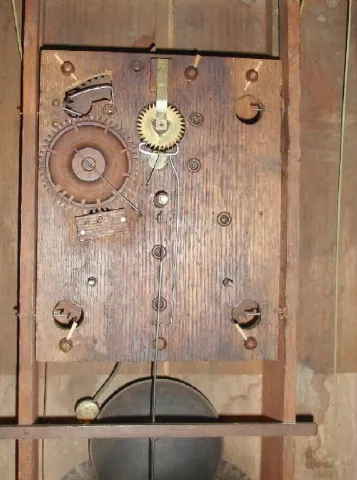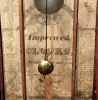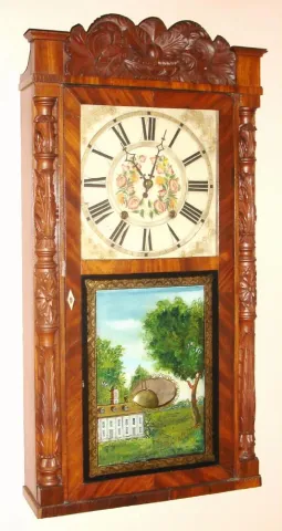 refinished mahogany veneered case in nice clean condition with some veneer loss and repairs on the base. A small piece is missing on the left carved column. Original painted dial is pretty clean for its age with some wear to the gilding and minor paint loss. Hands are original; tip to minute hand is short. Top glass is old, now held in place with wood strips. Bottom glass is a reverse-painted replacement. Label is dark with losses through mfg name, but enough remains to determine the maker. Running. Ht 34"