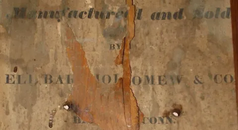 Eli Bartholomew and Co., Bristol, Conn., C.1833, 30-hour time/strike wood movement, carved half column and splat shelf clock. refinished mahogany veneered case in nice clean condition with some veneer loss and repairs on the base. A small piece is missing on the left carved column. Original painted dial is pretty clean for its age with some wear to the gilding and minor paint loss. Hands are original; tip to minute hand is short. Top glass is old, now held in place with wood strips. Bottom glass is a reverse-painted replacement. Label is dark with losses through mfg name, but enough remains to determine the maker. Running. Ht 34"