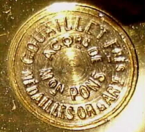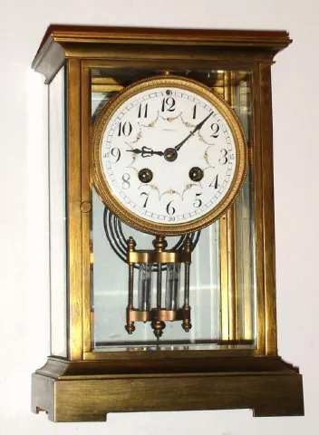 brass case in excellent condition, all four beveled glasses are perfect, the porcelain dial is signed "Tiffany and Co." (remains signature) with two minor hairlines outside the chapter ring between 9-10 (not visible in foto or beyond a foot). Period mercury and glass pendulum is intact with good vials. Movement marked with award medallion for Gouaillet {successors to Pons, note "Acq de Mon Pons" also shows in medallion}. Ht 10.5"