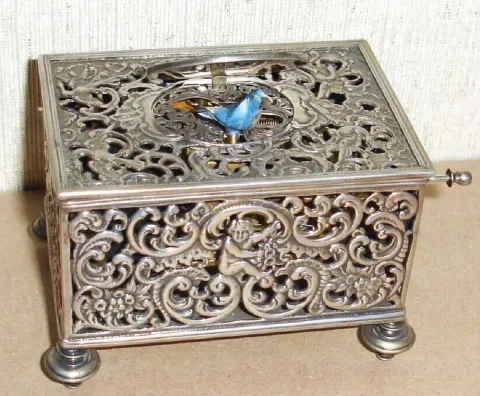 German, Singing Bird box, C.1995, an 800 silver box, nicely embosses and silvered, as-found