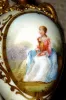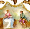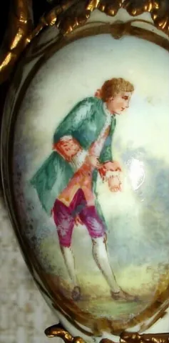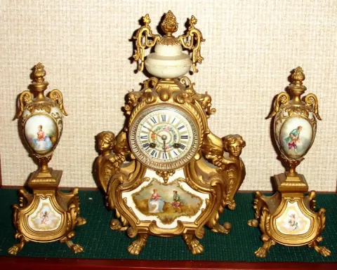 French, S. Marti, 3-piece garniture, gold painted white metal, with hand painted plaques and side urns, 8-day, strike, with fancy painted dial with floral wreath and gilt brass hands. rt. rear leg on clock is hanging by a thread and will need attention. Entire clock case and side pieces have been over-brushed with gold paint that is starting to lift. Top, center finial has been turned to match original and painted white. Dial and hands are xlnt; mov't complete and sound, No pendulum. Ht 16.5"