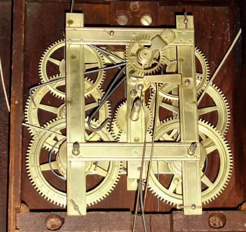 Birge and Fuller, Bristol, Conn., Circa 1840, 8-day time/strike column and cornice shelf clock. refinished mahogany veneered case in very clean condition with a small veneer repair and a couple of chips on the base. Both tablets are original with lower tablet being a nice Fenn glass Wooden dial, although nicely painted is a later replacement. Hour appears to be original. The minute hand is old, but looks to be a replacement. Dark, but readable label inside case. Ht 33"