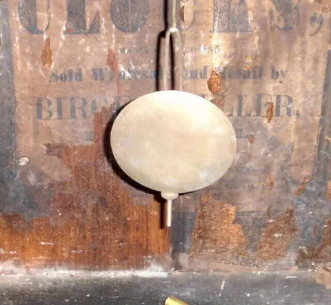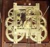 refinished mahogany veneered case in very clean condition with a small veneer repair and a couple of chips on the base. Both tablets are original with lower tablet being a nice Fenn glass Wooden dial, although nicely painted is a later replacement. Hour appears to be original. The minute hand is old, but looks to be a replacement. Dark, but readable label inside case. Ht 33"