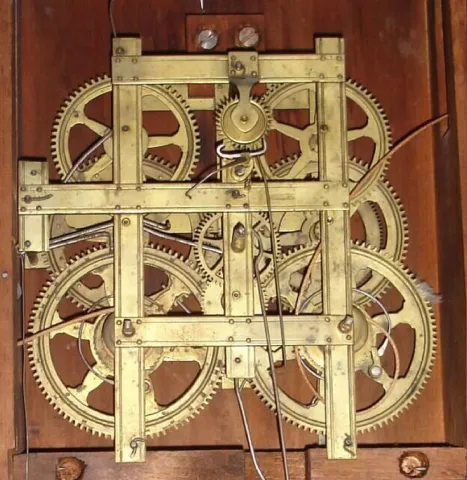 cornice is poorly replaced; general veneer issues on the doors. Dial with horizontal paint losses, still retains sliding mirror. Case retains original ball feet in the front, turned in rear. Large strap mov't is marked BMCo. Label is a bit dark, but fully legible. NO weights nor pend. Ht 35"