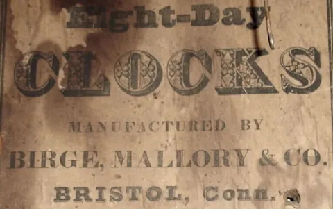 Birge, Mallory and Co., Bristol, Conn, C.1840, full column and cornice, 8-day time and strike. cornice is poorly replaced; general veneer issues on the doors. Dial with horizontal paint losses, still retains sliding mirror. Case retains original ball feet in the front, turned in rear. Large strap mov't is marked BMCo. Label is a bit dark, but fully legible. NO weights nor pend. Ht 35"