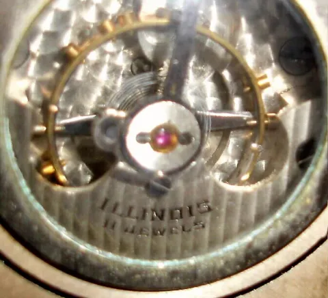 Sangamo Electric Co., Springfield, Ill., Circa 1928, An ingenious designed movement that uses jewel double-roller lever escapement from a 16 size Illinois pocket watch. The balance wheel is visible on the dial. An electric motor winds the movement in