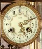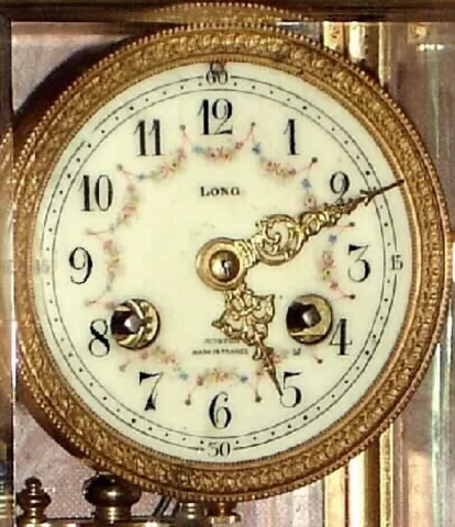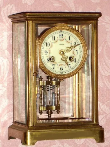French, Vincenti and Cie, 8-day time and gong strike, 4-glass crystal regular, in a smaller than usual size, and with porcelain dial having polychrome floral decorations, and the inscription "Long" and Boston, c.1900. brass case has oxidation and needs polishing.. Original porcelain dial has some minor roughness at the strike side winding arbor. Hands are original. The beveled glass panel on the back door has a small chip on lower corner. The rest of the beveled glass panels are fine. Movement is signed, with Vincenti award medallion for year 1855. Orig 2-vial pendulum is intact. Ht 8.75"