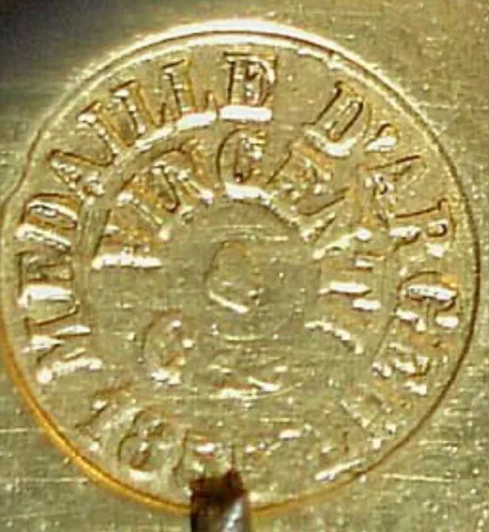 brass case has oxidation and needs polishing.. Original porcelain dial has some minor roughness at the strike side winding arbor. Hands are original. The beveled glass panel on the back door has a small chip on lower corner. The rest of the beveled glass panels are fine. Movement is signed, with Vincenti award medallion for year 1855. Orig 2-vial pendulum is intact. Ht 8.75"