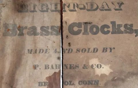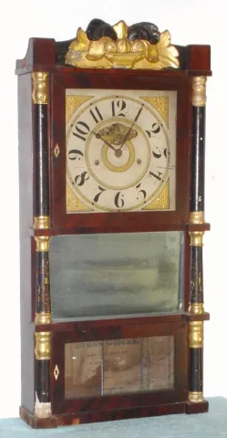 P. Barnes and Co., Bristol, Conn, 3-deck shelf clock, with extra large strap brass mov't [Ives rectangular style], time and strike, C.1836
