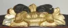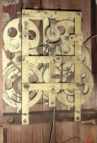feet are missing, bottom tablet clear, no glass in top, slide mirror behind dial is lacking. No chimney caps, one return missing. Hands are original. Columns retain original finish and gilding with wear and loss. Label inside with losses, but legible, NO weights. Note this has original large square cast gong base. Ht 35"