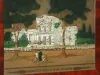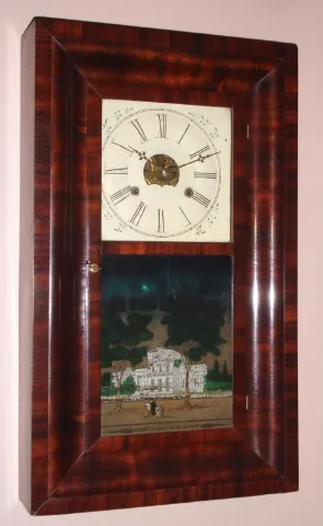 J. C. Brown, Forestville, Conn., C.1845, 30-hour time/strike OG shelf clock. rosewood veneered case in very nice clean condition in an old and possibly original finish with a couple of veneer chips on the front base. Original painted dial with some loss at the winding holes and mounting pins. Hands are replaced. Clean label inside case. Tablet with some minor loss is original. As a point of interest the house depicted in the tablet [residence of Ithial Town, Esq] was a former landmark in New Haven, but was razed in 1957. Ht 26"