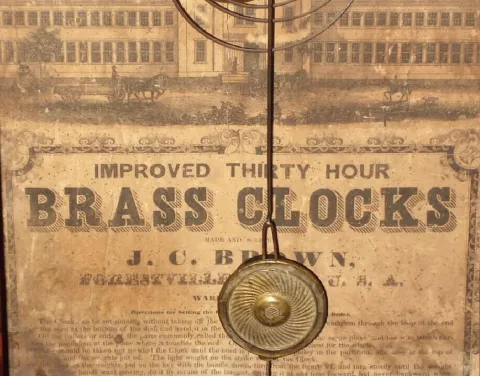 J. C. Brown, Forestville, Conn., C.1845, 30-hour time/strike OG shelf clock.
