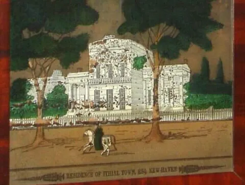 rosewood veneered case in very nice clean condition in an old and possibly original finish with a couple of veneer chips on the front base. Original painted dial with some loss at the winding holes and mounting pins. Hands are replaced. Clean label inside case. Tablet with some minor loss is original. As a point of interest the house depicted in the tablet [residence of Ithial Town, Esq] was a former landmark in New Haven, but was razed in 1957. Ht 26"