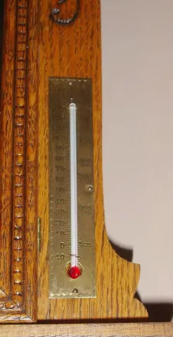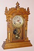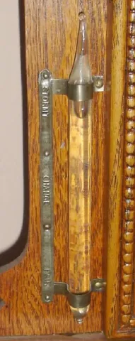 Waterbury Clock Co., pressed oak gingerbread clock with central calendar, time and gong strike, 8-day. Also with thermometer and weather tube intact, c.1900.