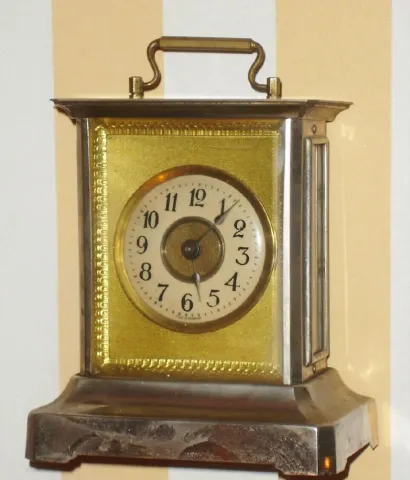 German, Badische Uhrenfabrik, c.1900, musical alarm clock, 1-day, back wind and set, with small cylinder box in the base. overall very good original condition, with original dial intact and the musical movement plays a lively tune for around 3 minutes before running down. Minor nicks and abrasion to case commensurate with age. Ht 7"