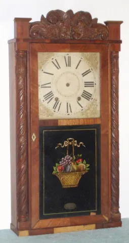 Case only, Samuel Terry, C.1835, carved column and splat. Note very unusual twisty carved columns and well detailed double cornucopia splat. case has some veneer issues...several large pieces missing and has been refinished long ago. However retains an excellent dial, decent but dark label. Note columns are like twisted vines with foliate capitals. Ht 33"