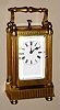 Swiss, carriage clock, miniature quarter hour repeater movement in Empire style polshed brass case with Roman numeral porcelain dial, c1900 good running order, ticks and repeats at will, the case is in good condition with some minor scratches, nicks and scuffs and a few chips and flakes in corners of glass on front door, the dial has no hairlines. Ht 5"