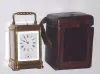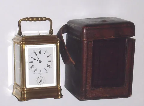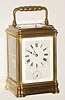 French, Henri Jacot, brass, Gorge cased carriage clock, time, stike, alarm and repeat with original leather covered carry case and key, C.1885 overall exceptionally clean and nice condition, in brisk running order. With Jacot tradmark (H + J either side of a parrot on a stand) on rear plate, serial No. 2511. Ht 7"