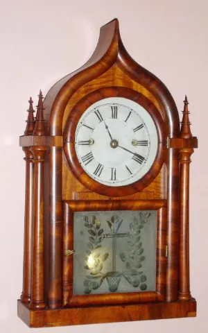 J. C. Brown, Forestville Mfg, Forestville, Conn, four poster gothic w/ ogee top (some call it onion top) case, with well figured mahogany veneer and with cut glass tablet, 8-day FUSEE, C.1848,