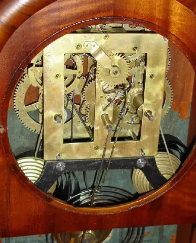 the case has been nicely refinished and is in good condition; there are 2 veneer repairs along the base.. The original dial is excellent and the original label is excellent. The movement has been professionally cleaned and is in good running order. This is the same fusee movement used in the small shelf acorn, see Ken Roberts on Connecticut Clock Technology, page 255. Ht 20"