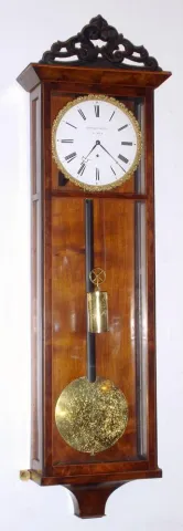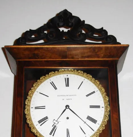 Austrian, Elsner and Petrovits, in Wien, C.1840, 6-light Dachluhr, single weight timepiece, 8-day; mov't original to case. the rosewood and grained case has been refinished and the molded top trim is new. Early pendulum is brass both sides; note bob is perfect, but lacquer has crystallized producing an odd foto. Movement has been cleaned and running dial excellent, good signature. Has old glass with grains and fish eyes. For similar clocks, see Kaltenb/dcks book titled "Viennese Timepieces", page 212. Ht 37"