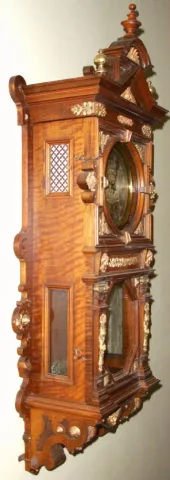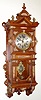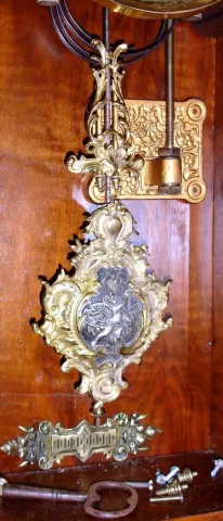 German, Lenzkirch, Walnut cased wall clock with profuse gilt bronze trim, 8-day spring movement, gong striking with extra fancy cast and chased baroque style pendulum with a silvered cherub in the center. some of the smaller bronze bits are off and inside the clock, if there is a missing bit, it is not noticeable. The clock is otherwise in excellent original condition. Ht 37.5"