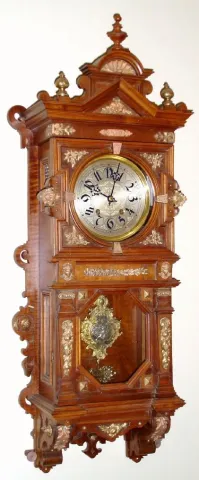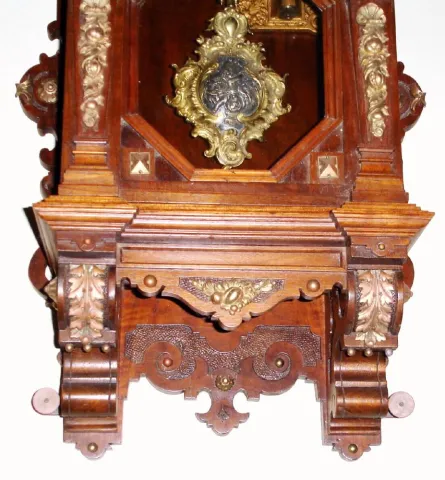 German, Lenzkirch, Walnut cased wall clock with profuse gilt bronze trim, 8-day spring movement, gong striking with extra fancy cast and chased baroque style pendulum with a silvered cherub in the center.