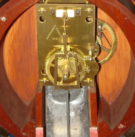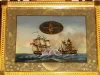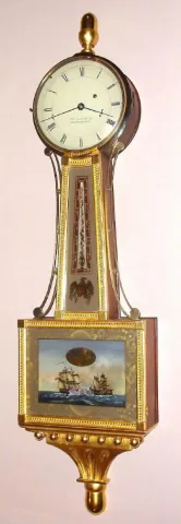 T. E. Burleigh Jr., Winchester, Mass., reproduction presentation banjo timepiece with time only weight driven movement in mahogany case with gilt rope front and reverse painted tablet depicting the ship's United States and Macedonian in a gun battle from
